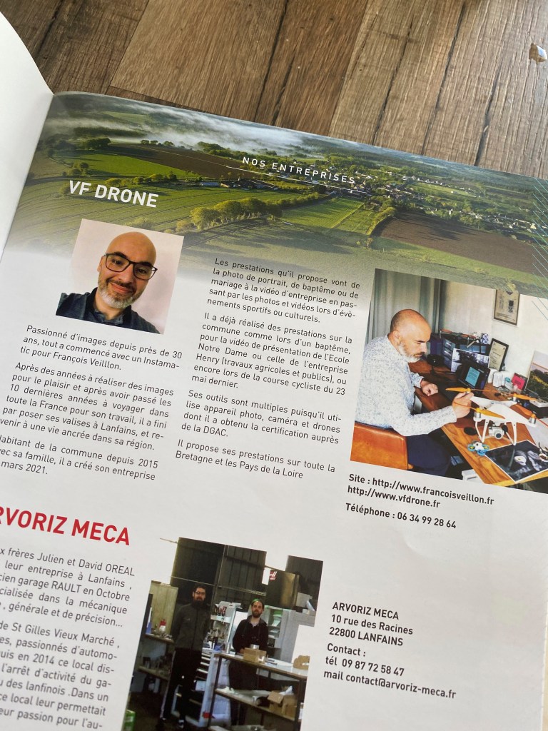 VF Drone est à l’honneur dans le bulletin municipal de Lanfains du mois de Juillet, le Petit Pillotou. Un grand merci à la municipalité pour cette mise en avant de mes activités, que ce soit les prises de vues et photos aériennes comme les sessions de studio photo itinérant dans les Côtes d’Armor et en Bretagne (prestation photos pro : www.francoisveillon.fr ), ou encore la réalisation et le montage de vidéos professionnelles dans toute la Bretagne et les Pays de la Loire.